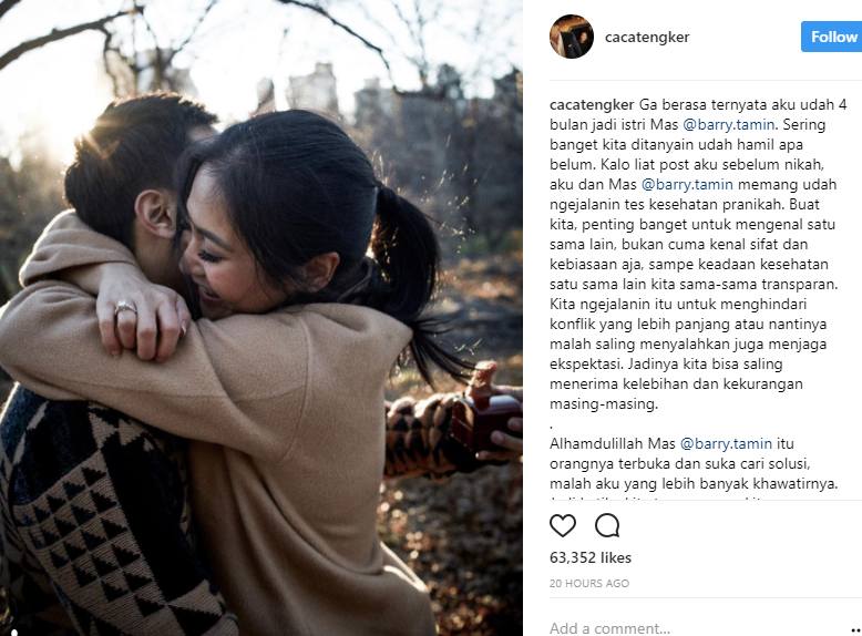 "Ga berasa ternyata aku udah 4 bulan jadi istri Mas @barry.tamin. Sering banget kita ditanyain udah hamil apa belum. Kalo liat post aku sebelum nikah, aku dan Mas @barry.tamin memang udah ngejalanin tes kesehatan pranikah. Buat kita, penting banget untuk mengenal satu sama lain, bukan cuma kenal sifat dan kebiasaan aja, sampe keadaan kesehatan satu sama lain kita sama-sama transparan," tulis Marsha.