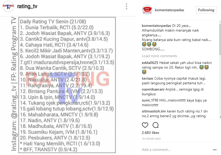 Melalui postingan akun @komentatorpedas, terlihat daftar rating dari berbagai program televisi di Tanah Air. Berdasarkan hasil rating pada Senin, 21 Agustus lalu, tampak sinetron "Dunia Terbalik" tetap menjadi unggulan pemirsa. Sebaliknya, "Pesbukers" berada di urutan paling akhir, yaitu nomor 20. Padahal, sebelumnya rating tayangan "Pesbukers" tak sampai turun drastis.