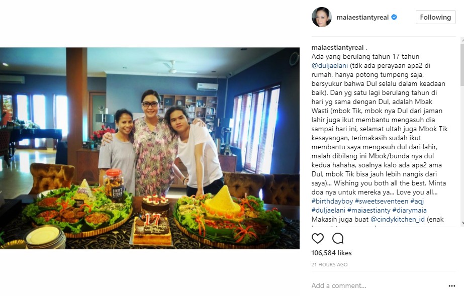 Perayaan ulang tahun yang kebetulan sama dengan pengasuh Dul, Mbak Wasti alias Mbok Tik semakin menambah warna bagi Maia. Ibu tiga anak itu pun sengaja menyiapkan tumpeng untuk dua orang tersayangnya itu. "Ada yang berulang tahun 17 tahun @duljaelani (tdk ada perayaan apa2 di rumah, hanya potong tumpeng saja, bersyukur bahwa Dul selalu dalam keadaan baik). Dan yg satu lagi berulang tahun di hari yg sama dengan Dul, adalah Mbak Wasti," tulis Maia dalam keterangan postingannya.