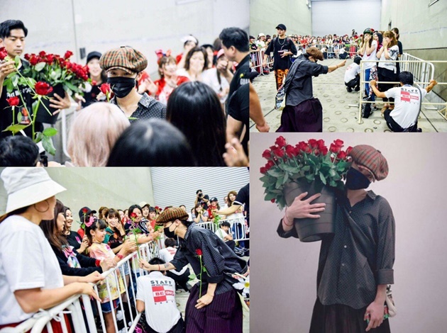Lebih melelehkan hati, sebelum membagikannya G-Dragon yang memakai masker dan topi itu bahkan ikut turun langsung membersihkan duri dari tangkai bunga agar tidak melukai tangan fans. Setelah itu dia membagikan bunga kepada sekitar 80 fans yang sabar menanti kehadirannya di event tersebut.