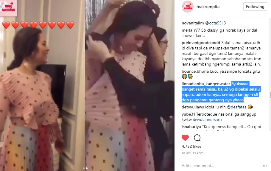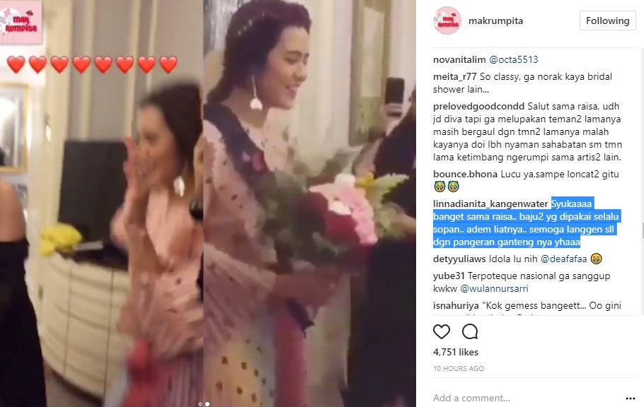"Yaya cantik bgt,keren bridal showernya ga kayak yg skrg lg kekinian ada kue porno alay,corat coret dan dancer cowo ,calon penganten baju seksi dll,pokonya top bridal showernya," puji Vatiaa. "Syukaaaa banget sama raisa.. baju2 yg dipakai selalu sopan.. adem liatnya.. semoga langgen sll dgn pangeran ganteng nya yhaaa," tambah yang lain.