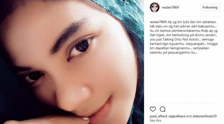 "Kangen kamuuuh...jarang ketemu kangen, sering ketemu malah tambah kangen. Caramu merindukanku, caramu mencintaiku, caramu berbicara pdku dan caramu memikirkanmu, caramu memanjakanku, it's a gift from Allah," tulis akun bernama Wulan tersebut. "Km baik sayangku. Thanks for your big love to me. Km milik Allah, krn itu ak mencintaimu krnNYa.. ".