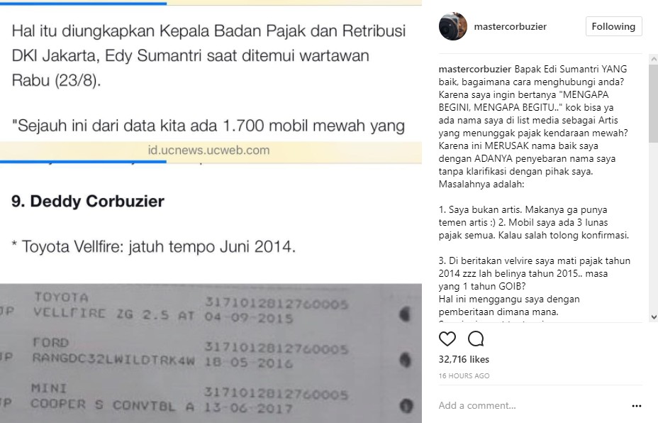 Hingga kini, rupanya kekesalah Deddy masih belum reda. Melalui postingannya, mantan suami Kalina Oktarani itu pun melayangkan protesnya pada pihak berwajib. "Bapak Edi Sumantri YANG baik, bagaimana cara menghubungi anda? Karena saya ingin bertanya "MENGAPA BEGINI, MENGAPA BEGITU.." kok bisa ya ada nama saya di list media sebagai Artis yang menunggak pajak kendaraan mewah?" tulis Deddy dalam keterangan postingannya.