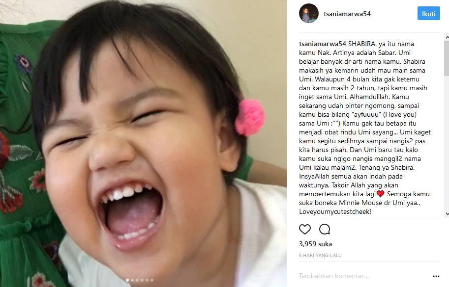 "SHABIRA. ya itu nama kamu Nak. Artinya adalah Sabar. Umi belajar banyak dr arti nama kamu. Shabira makasih ya kemarin udah mau main sama Umi. Walaupun 4 bulan kita gak ketemu dan kamu masih 2 tahun, tapi kamu masih inget sama Umi," tulis Tsania.