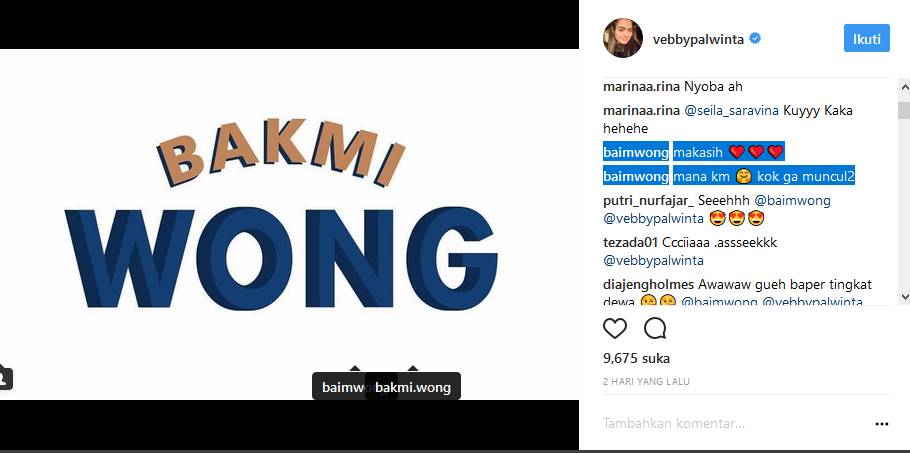 "Asikk! BAKMI WONG Tanah Kusir udahh bukaaa! Enaknya poollll !yuk melipir2 cobain @bakmi.wong nya. Btw Congrats bim! @baimwong," tulis Vebby dalam keterangan foto tersebut.