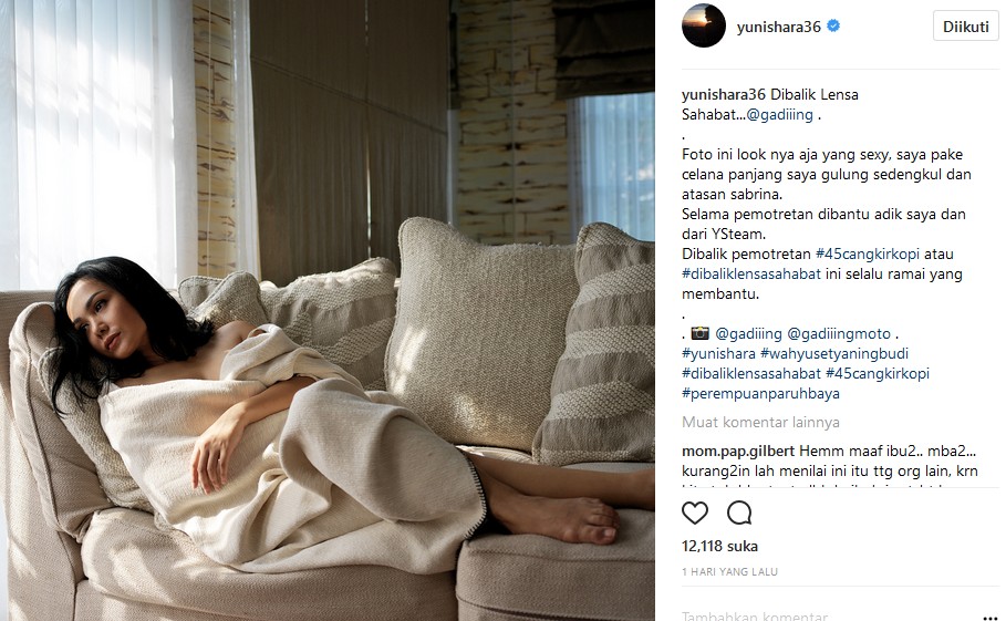 "Dibalik Lensa Sahabat...@gadiiing. Foto ini look nya aja yang sexy, saya pake celana panjang saya gulung sedengkul dan atasan sabrina. Selama pemotretan dibantu adik saya dan dari YSteam. Dibalik pemotretan #45cangkirkopi atau #dibaliklensasahabat ini selalu ramai yang membantu," tulis Yuni Shara panjang.
