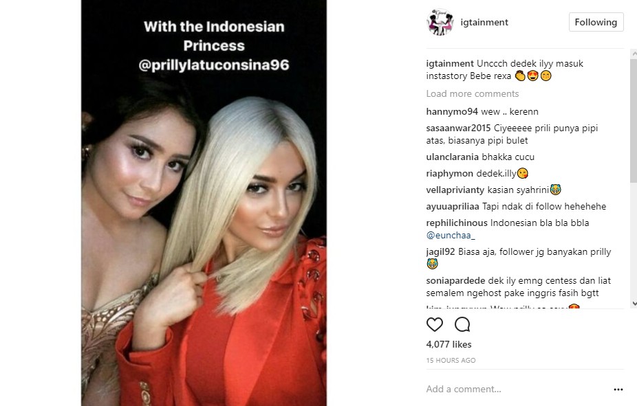 Dalam keterangan postingan Bebe, pelantun "Back to You" itu bahkan tak segan menyebut Prilly adalah seorang putri dari Indonesia. "With the Indonesian Princess @prillylatuconsina96," tulis Bebe dalam keterangan postingannya.