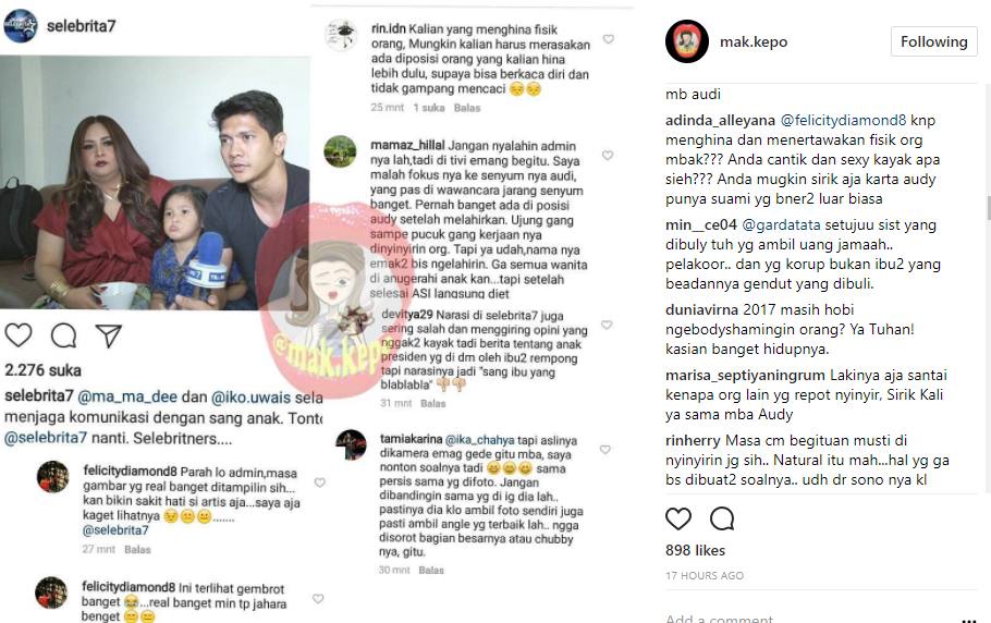 Mengetahui hal ini berbagai opini membanjiri komentar Instagram @selebrita7 yang kemudian diunggah ulang oleh akun gosip @mak.kepo. Mereka mengatakan bahwa admin dari @selebrita7 jahat lantaran mengungkap bentuk tubuh asli Audy.