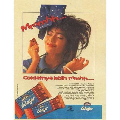 Meski ada di zaman dulu, tapi bahasa yang digunakan dalam iklan ini terlihat kekinian dan ala anak gaul. Lucunya, ada kalimat yang menjelaskan kalau wafer ini pintar. Udah lulus sekolah dong berarti? Hehe..