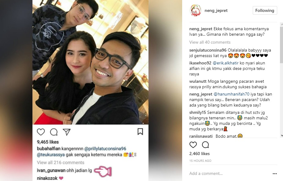 Postingan itu pun sukses mencuri perhatian netizen. Terlebih saat Ivan Gunawan menuliskan komentarnya pada postingan Bubah Alfian. Entah sengaja atau tidak, selebritis sekaligus desainer yang akrab disapa Igun itu seolah membeberkan hubungan spesial Prilly dan Rassya di masa lalu. "ohh jadian lg," kata Igun.