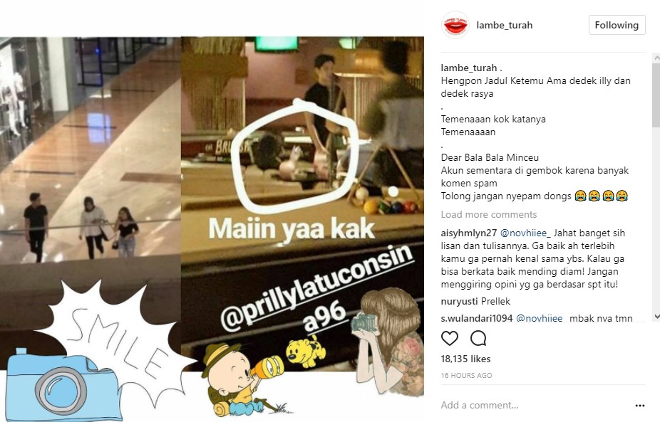 Sementara itu, pada postingan akun gosip lain, @lambe_turah "menangkap" momen kebersamaan Prilly dan Rassya yang tengah jalan berdua di salah satu pusat perbelanjaan. Dalam postingan tersebut juga tampak Prilly dan Rassya yang bermain di salah satu arena billiard. "Maiin yaa kak @prillylatuconsina96," tulisan dalam keterangan postingan itu.