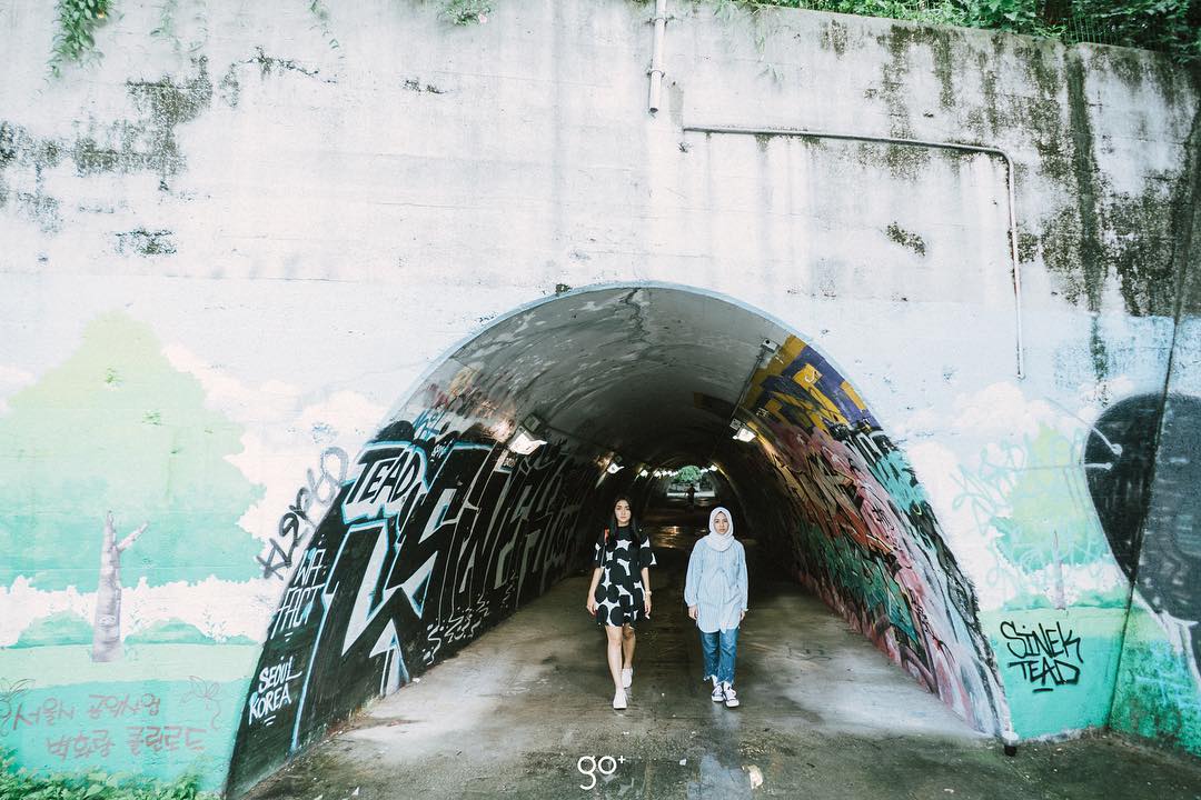 Pasti kalian semua tahu banget adegan apa yang terjadi dalam terowongan ini bukan? Nih, Natasha Rizki dan Citra Kirana peragakan lagi.