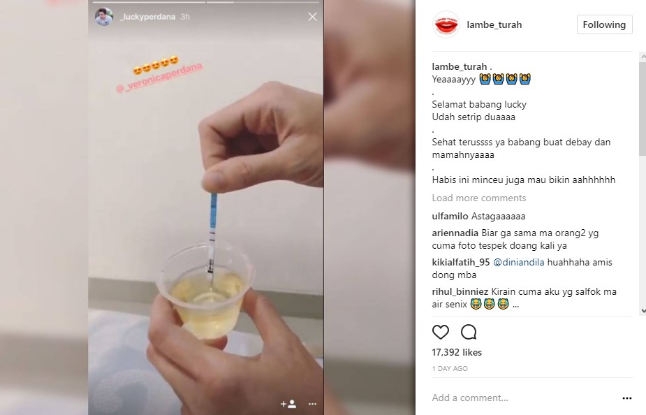 Sejumlah netizen pun tak segan menjadikan postingan Lucky Perdana itu sebagai bahan guyonan. "Hahahahaha ngilani. Urine nya knp ikut di foto," ujar netizen. "Hrusnya sensor tuh urine. Biar artis juga namanya kencing tetep geli," ujar lainnya. "Sumpah baru kali ini lihat org post test pack sekalian air seni nya..suami nya pula yg post..bukannya biasa istri tu test diam2 hbs tu baru kasih lht test pack ke suami sebagai kejutan..itu pun istri g kasih air seni nya, biasa jg lgsg di buang wkwkwk," imbuh lainnya.