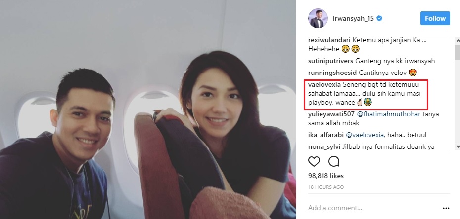 Sementara itu, netizen malah menduga Velove pernah menjadi salah satu mantan kekasih Irwansyah. "Brrti mbak @vaelovexia pernah jd mantannya jg nh," ujar netizen. "Nannti Mantan @irwansyah_15 alasan aja sahabat @vaelovexia Jaman sekarang kan Mantan Di bilang Sahabat," ujar lainnya. "Eahhhh flasback di pesawat garuda," imbuh lainnya.