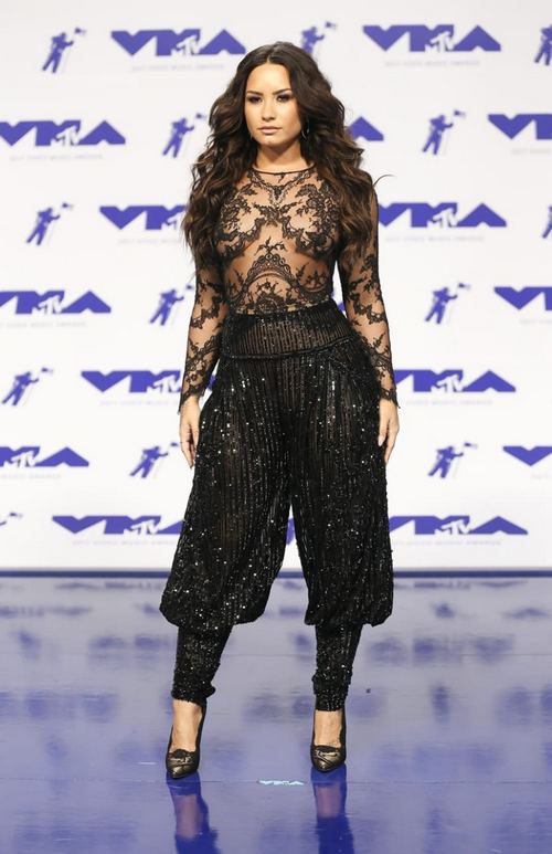 Demi Lovato pun tak mau ketinggalan tren. Ia tampil 'berani' dengan gaun berbahan tulle hitam, lengkap dengan aksen lace. Bagian bawahnya dirancang menyerupai hareem pants, lengkap dengan aksen sequin nan glamor.