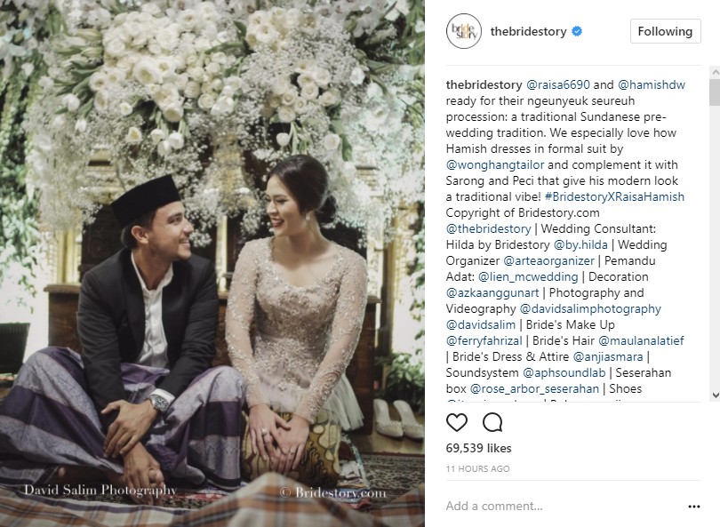 Dalam postingan diabadikan oleh @thebridestory, tampak salah satu potret yang sukses mencuri perhatian. Momen tersebut menampilkan Raisa dan Hamish yang saling menjatuhkan pandangan mereka satu sama lain. Cara duduk khas wanita anggun tampaknya semakin membuat Raisa menjatuhkan pesonanya pada Hamish. Sebaliknya, sambil memegang salah satu telapak kakinya, Hamish duduk bersila tanpa melepas pandangannya dari Raisa