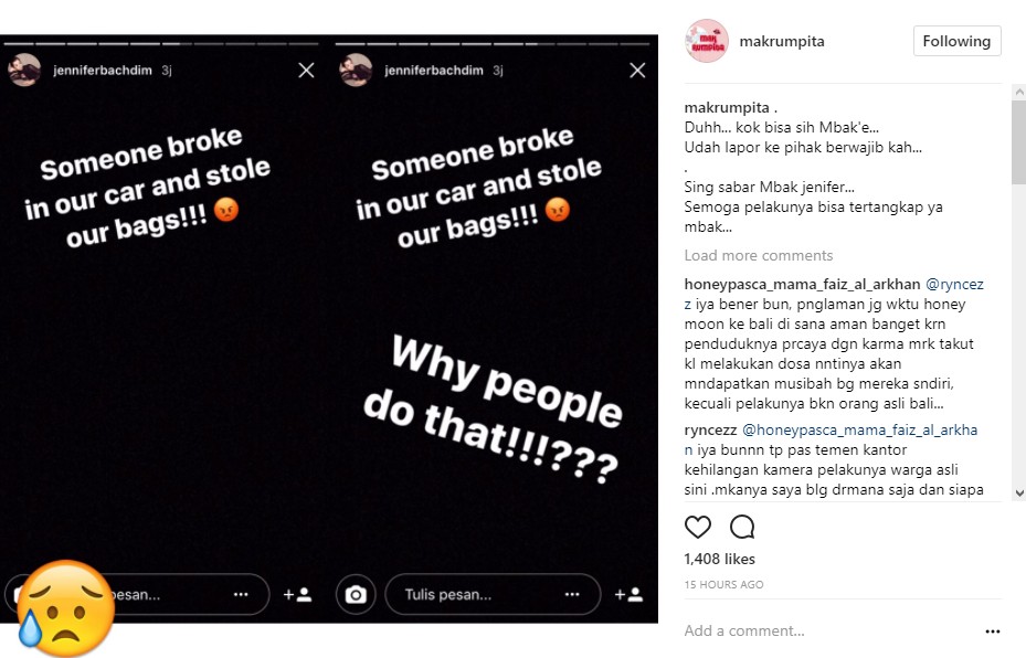 Karena hal tersebut, Jennifer pun melampiaskan kekesalannya dengan membagikan postingan di Instagram Story. "Someone broke in our car and stole our bags!!! Why people do that!!!??? (seseorang menghancurkan mobil kami, dan mencuri tas kami!!! Kenapa orang melakukan itu!!!???)" tulis Jennifer sambil mengimbuhkan emoji marah.