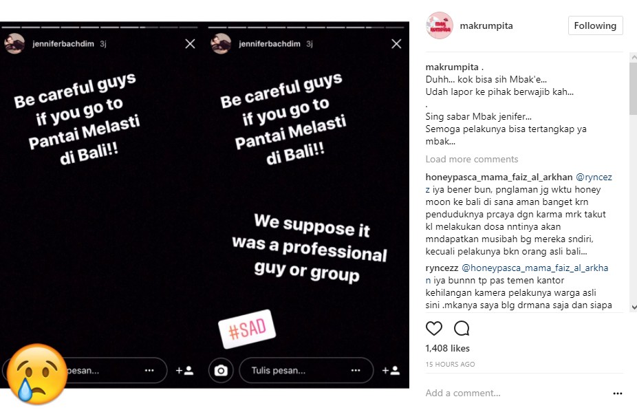 Kejadian memprihatinkan yang dialaminya itu membuat Jennifer ikut mengingatkan publik untuk selalu berhati-hati jika pergi ke Pantai Melasti. Menurut Jennifer, dugaan sementara oknum yang melakukannya adalah seorang lelaki maupun grup profesional. "Be careful guys if you go to Pantai Melasti di Bali!!! We suppose itu was a professional guy or group," lanjutnya.