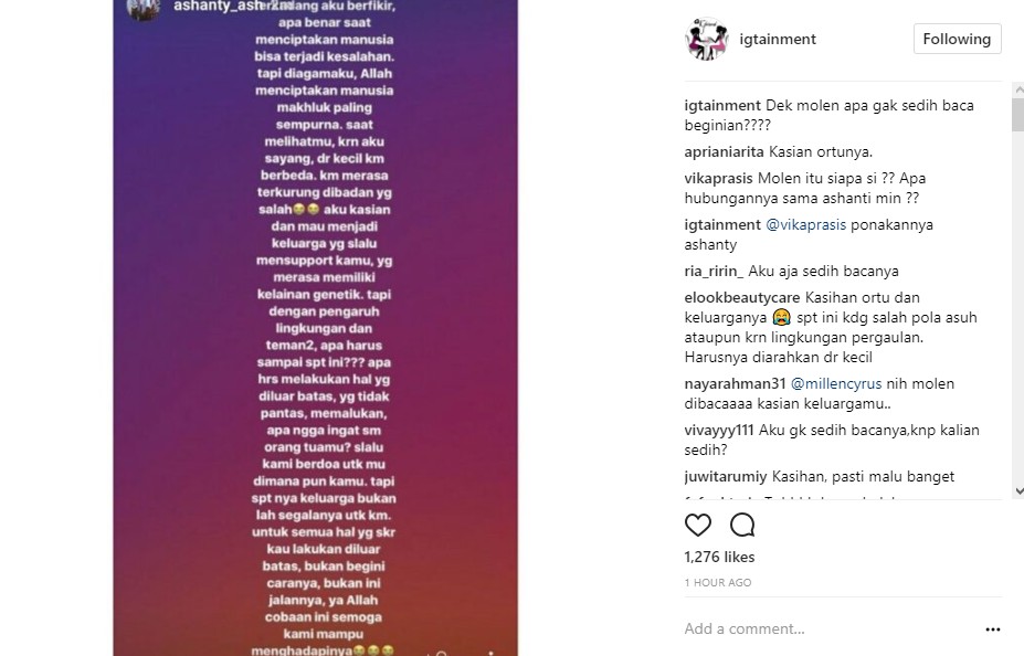 Postingan yang diunggah ulang oleh akun gosip itu sontak mencuri simpati netizen. "Aku aja sedih bacanya," ujar netizen. "Kasihan ortu dan keluarganya spt ini kdg salah pola asuh ataupun krn lingkungan pergaulan. Harusnya diarahkan dr kecil," ujar lainnya. "Kasian bunda ash, si millen udah enak lu jd ponakan artis, bukannya manfaatin bisnis kek, model, casting atau nyanyi dah sklian ini jauh bgt," timpal lainnya.