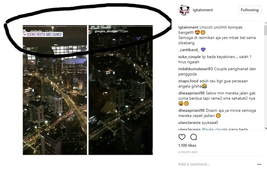 Dalam postingan itu, tampak Giorgino dan Ibel kompak membagikan potret gemerlap kota Jakarta. Waktu posting yang dilakukan dua selebritis itu pun tampak sama. Berbeda dengan Giorgino, Ibel mengimbuhkan lokasi keberadaannya pada malam itu.