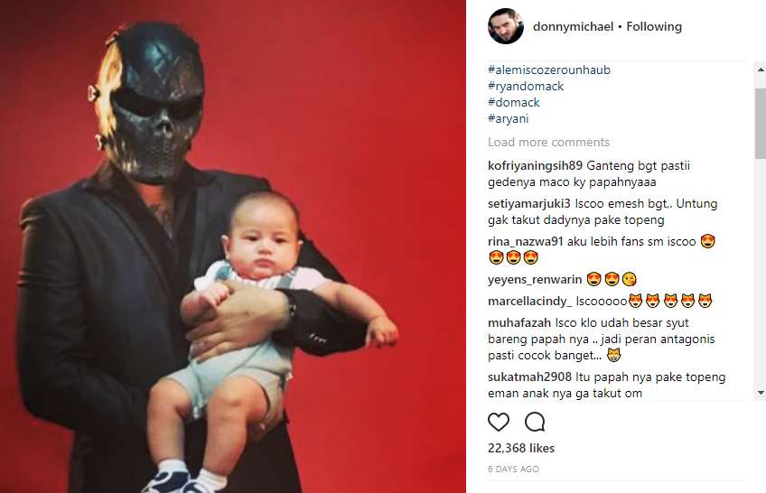 "Isco ny takut tu sm papa ny pke topeng gtu," ujar salah satu netter. "Ya allah siii bapak tuh anak, ga takut apa,,,,," kata mulyana4157. "Ya ampun pak..serem ih hahah," ujar yang lain. "Sama gantengnya, Kak Donny Michael topengnya serem," pungkas devitamery.