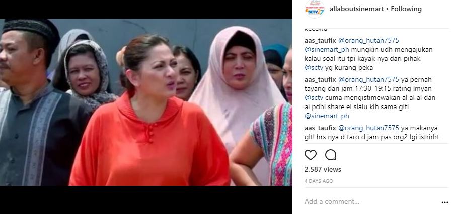 "Ya pernah tayang dari jam 17:30-19:15 rating lmyan @sctv cuma mengistimewakan al al al dan al pdhl share el slalu klh sama gltl @sinemart_ph," protes netter.