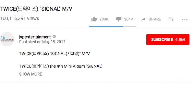 Semua video musik Twice pun tercatat telah ditonton lebih dari 100 juta kali di YouTube. Mulai dari "Cheer Up", 'TT", "Like OOH-AHH", "Knock Knock" dan terakhir "Signal". Khusus untuk MV "Cheer Up" dan "TT" sendiri bahkan telah ditonton lebih dari 200 juta kali di YouTube.
