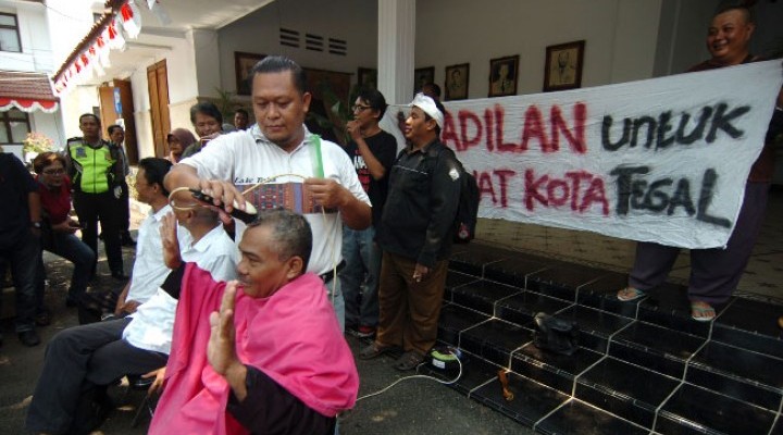 Sejumlah PNS nonjob melakukan aksi cukur gundul sebagai bentuk rasa syukur dan buang sial atas penangkapan Wali Kota Tegal, Siti Masitha Soeparno.