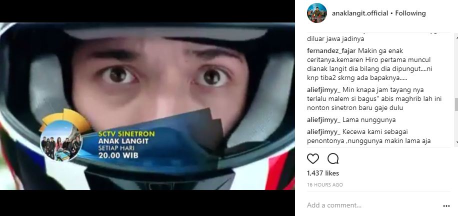 "Kemaleman di daerah kalsel kalau jam tayang 20.00 WIB.. Jgn digeser2 dong @anaklangit.official," tulis adhe_mawaddah.