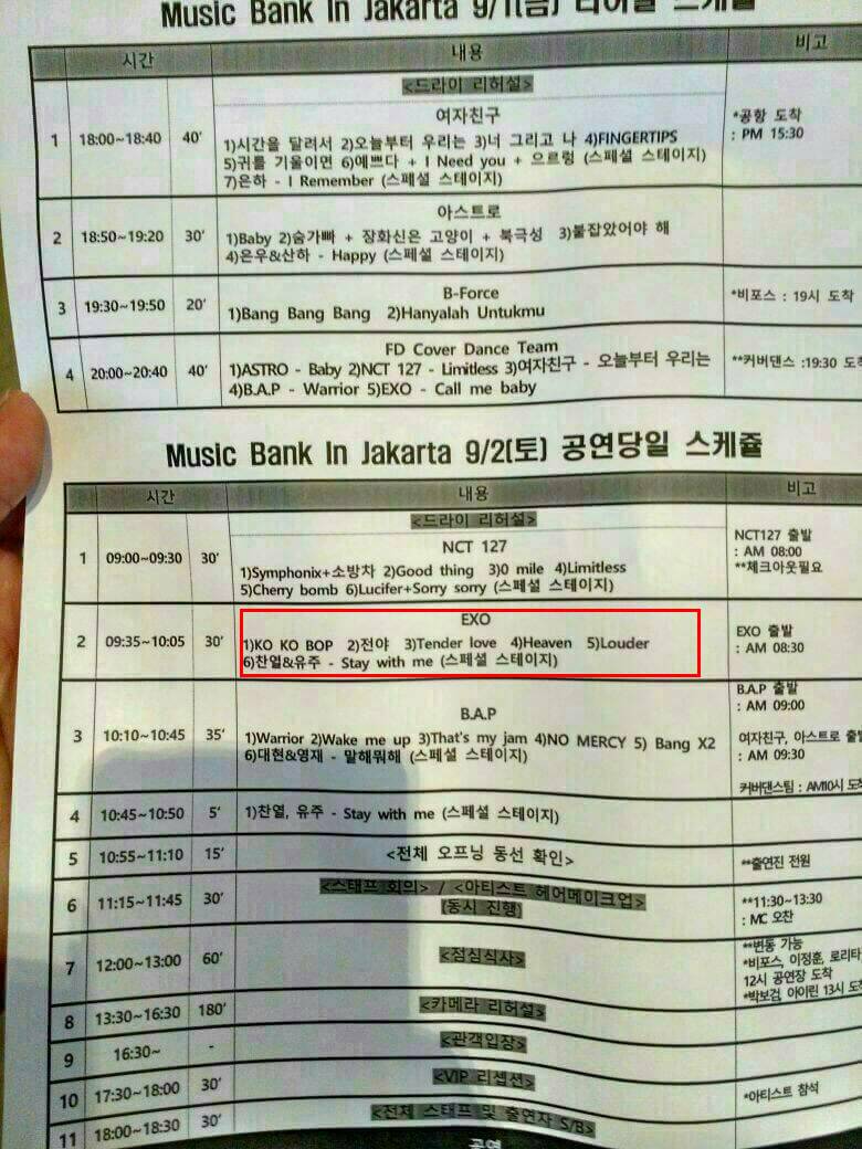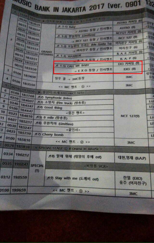 Setelah ada seorang sumber yang menunjukkan rundown konser Music Bank, fans melihat bahwa durasi penampilan boyband besutan SM Entertainment itu terlalu sedikit. Dalam lembaran itu tertulis bahwa EXO akan menampilkan lagu "Call Me Baby" tidak sampai satu menit dalam Grand Opening.
