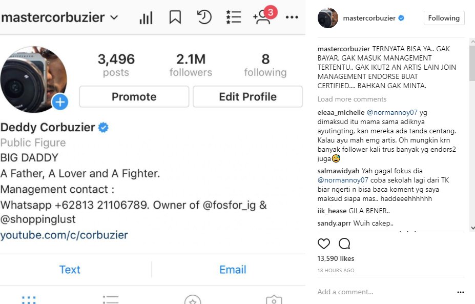 Di sisi lain, sejumlah netizen menilai caption Deddy itu sarat akan sindiran pada seseorang. "Ah Om @mastercorbuzier kadang nyindir siapa gtu," kata netizen sambil menambahkan emoji tertawa. "Yoiii. Nyindirnya joss boss. Selamat om buat centang biruunyaaa," timpal lainnya.