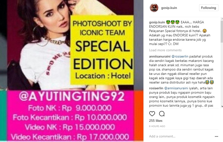Soal tarif, rupanya Ayu Ting Ting tak mematok sembarang harga. Bahkan, lebih mengejutkan lagi, pelantun "Kamu Kamu Kamu" itu dikabarkan telah menaikkan tarif endorse. "EAAA.... HARGA ENDORSAN KUIN naik.. nich bebs Pelayanan Special fotonya di hotel.. Adakah yg mau ENDORSE kuin?? Apakah kenaikan harga endorse karena job yg mulai sepi?? Cr. DM," tulis akun @gosip.kuin dalam keterangan postingannya.