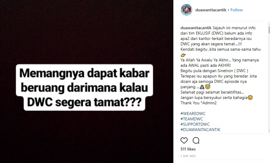 "Sejauh ini menurut info dari tim EKLUSIF (DWC) belum ada info apa2 dari kantor terkait beredarnya isu DWC yang akan segera tamat....!!!," tulis admin akun Instagram @duawanitacantik.
