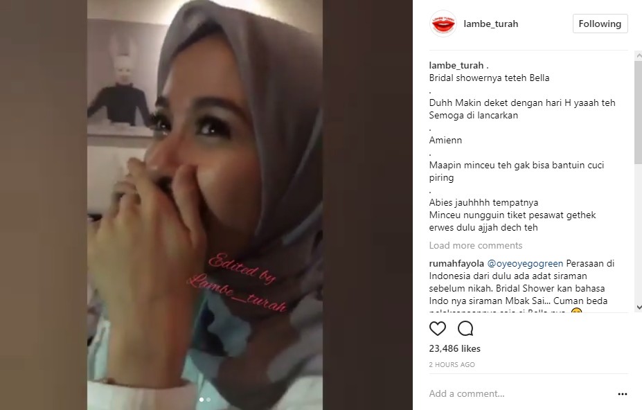 Melalui postingan yang diunggah ulang oleh akun gosip @lambe_turah, Bella tak dapat menyembunyikan kebahagiaannya. Bahkan, dara 29 tahun itu sampai bersorak riang karena dirinya akan segera menjadi seorang istri. "Sold out, say," kata Bella diselingi tawa darinya dan para sahabat. Tak lupa pula, ia menunjukkan cincin yang telah terpasang di jari manis tangan kanannya.