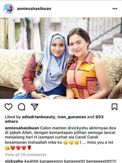 Hal tersebut terlihat dari unggahan Anniesa Hasibuan di akun Instagram pribadinya beberapa waktu lalu sebelum ia ditangkap polisi. "Calon manten @vickyshu akhirnya doa di ijabah Allah, dengan kemantapan pilihan semoga lancar menjelang hari H (sempet curhat ala Candi Candi kesampean inshaallah mbak ku) ... miss you a lot," tulis Anniesa Hasibuan di keterangan fotonya bersama Vicky Shu.