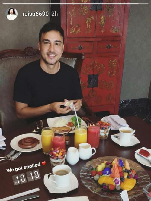 Terlihat Hamish yang memakai kaos polos warna hitam, duduk di kursi meja makan dengan wajah yang terlihat segar. Di hadapannya tersaji menu-menu sarapan nan lezat, mulai jus buah, roti, sayur, kopi, salad, dan kue. Sementara Raisa tampaknya mengambil gambar Hamish dengan kamera ponselnya. "We got spoiled (Kami dimanjakan)," tulis Raisa di keterangan fotonya dengan emoticon love dan jam yang menunjukkan pukul 10.19 pagi.