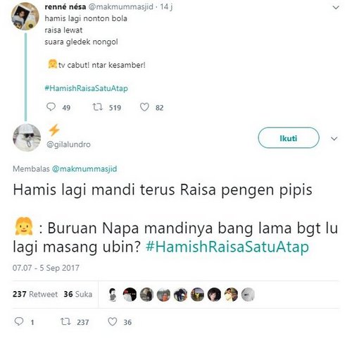 Di Twitter tengah ramai akan kemunculan hashtag #RaisaHamishSatuAtap yang membahas malam pertama hingga drama dalam rumah tangga yang akan dialami Raisa dan Hamish sesuai imajinasi netizen masing-masing. Cuitan para netizen pun bisa dibilang sangat kocak.