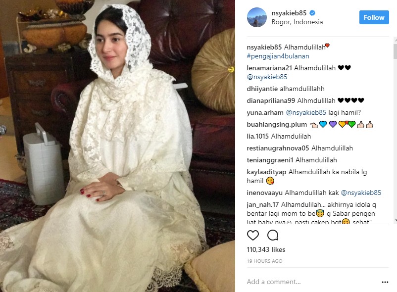 Melalui postingan di akun Instagram pribadinya, Nabila tampil cantik dengan pakaian serba putih. Kerudung putih juga ikut membalut rambut di kepalanya. "Alhamdulillah #pengajian4bulanan," tulis Nabila tak bisa menyembunyikan kebahagiaannya.