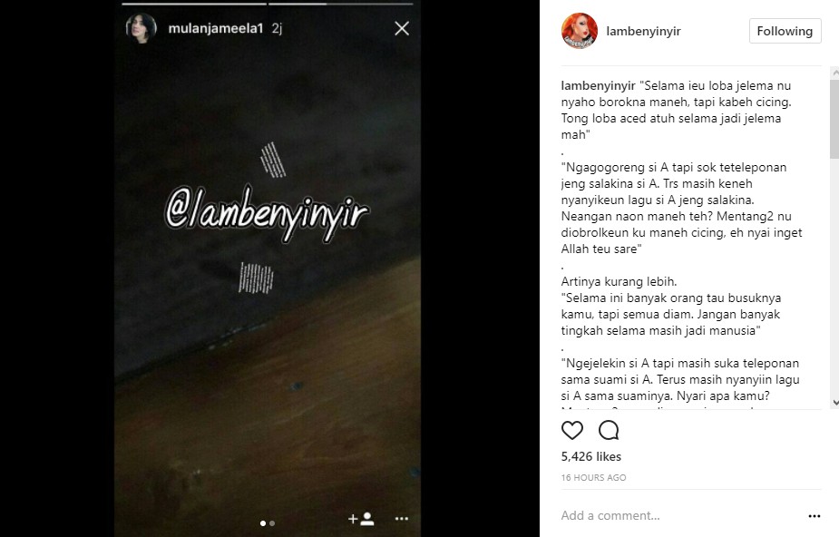 Dengan kalimat berbahasa Sunda, ibu satu anak itu mengungkapkan keburukan seseorang yang tak disebutkan namanya. "Selama ieu loba jelema nu nyaho borokna maneh, tapi kabeh cicing. Tong loba aced atuh selama jadi jelema mah (Selama ini banyak orang tau busuknya kamu, tapi semua diam. Jangan banyak tingkah selama masih jadi manusia)," tulis Mulan Jameela yang diterjemahkan ulang oleh akun @lambenyinyir.