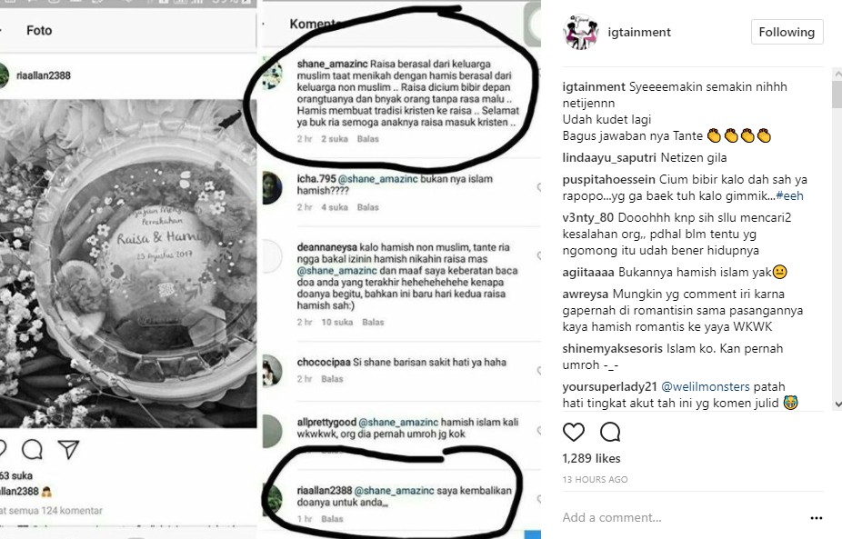 Hal tersebut bermula dari komentar seorang netter bernama @shane_amazinc di laman Instagram ibu Raisa, Ria Mariaty. Padahal, postingan Ria hanya menampilkan makanan yang tersaji saat pengajian menjelang pernikahan Raisa dan Hamish. Namun, netter itu tiba-tiba malah membahas soal ciuman Raisa dan Hamish.