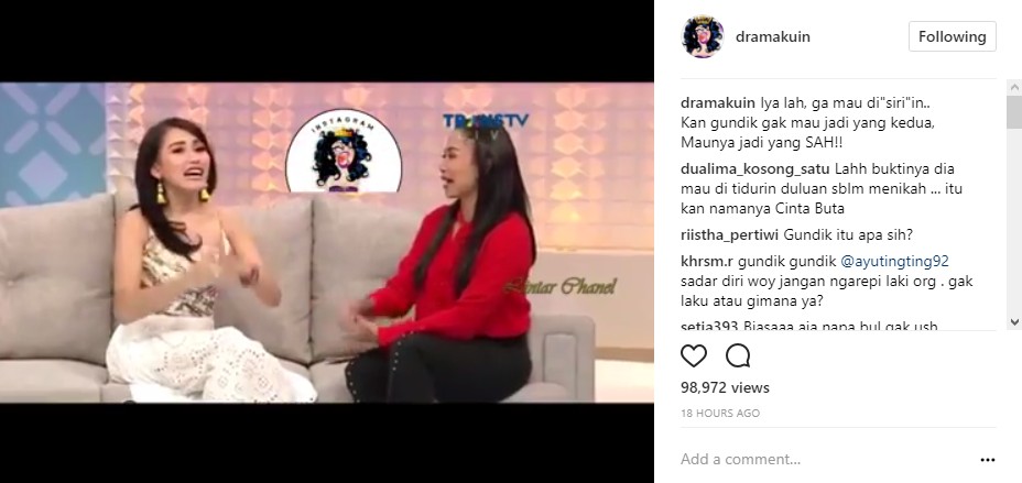 Melalui salah satu tayangan program televisi yang diunggah ulang oleh akun @dramakuin, tiba-tiba Feni Rose menanyakan soal nikah siri pada Ayu Ting Ting. "Seandainya, ada seorang laki-laki yang kamu suka banget. Kamu juga cinta sama dia. Tapi dia sudah beristri dan dia ngajak kamu untuk menikah siri. Apa yang akan kamu lakukan? Kamu cinta banget sama dia, dia juga cinta banget sama kamu," kata Feni Rose.