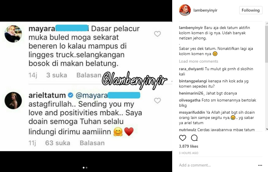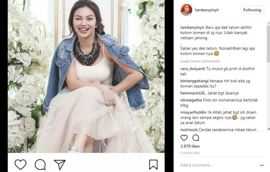 Usai lama tak mengaktifkan kolom komentar Instagramnya, serorang netter malah melayangkan hujatan pada Ariel Tatum.