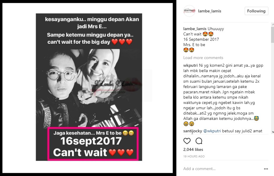 "Selamat Bella n abang E , semoga samawa barakallah dunia akherat," kata netizen dengan emoji tanda hati. "Slamet ya buuuu.. smoga lancar pernikahannya.. tidak ada lg batal2 smoga awet jg, keluarga samawa #apasihpadahalbelomkawin hahahh," kata lainnya. "Setuju banget mb Bell segera d halalin drpd jd fitnah.. Jodoh itu kita ga pernah tau n ga bs di tebak.. Semoga SaMaWa ya mb Bell n Babang E.. Aamiin," imbuh lainnya.
