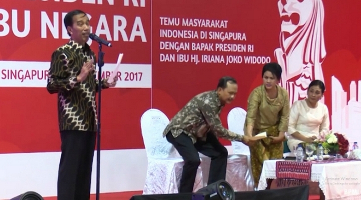Meski begitu, Jokowi rupanya memilih untuk mengacuhkannya. Kertas yang diberikan oleh Iriana hanya dipegangnya bersama bahan pidato lain. Tak menyerah begiru saja, Iriana tampak mengambil kertas dengan ukuran lebih besar. Ibu tiga anak itu kemudian meminta Duta Besar Indonesia untuk Singapura, Ngurah Swajaya untuk kembali menyerahkannya ke Paspampres.