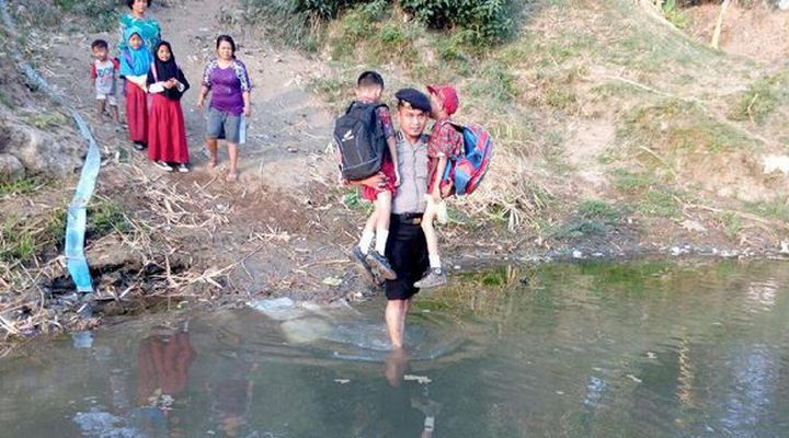Hal tersebut kemudian mengetuk hati seorang polisi di Cirebon. Dalam sebuah foto yang beredar di media sosial belakangan ini terlihat polisi itu menggendong dua anak SD sekaligus untuk menyeberangi Sungai Cisanggarung. Sang polisi itu dengan sigap membantu lantaran dua bocah laki-laki itu kesulitan berjalan melewati sungai tersebut dan demi menghindarkan seragam mereka basah dan kotor. Keduanya adalah siswa SDN 2 Ciledug Wetan, Kecamatan Ciledug, Kabupaten Cirebon, Jawa Barat.