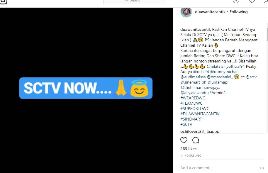 "Pastikan Channel TVnya Selalu Di SCTV ya gais ( Meskipun Sedang Iklan ) 🙏😇 PS :Jangan Pernah Mengganti Channel TV Kalian," kata admin @duawanitacantik. "Karena itu sangat berpengaruh dengan jumlah Rating Dan Share DWC !! Kalau bisa jangan nonton streaming ya ...!! Bissmillah."