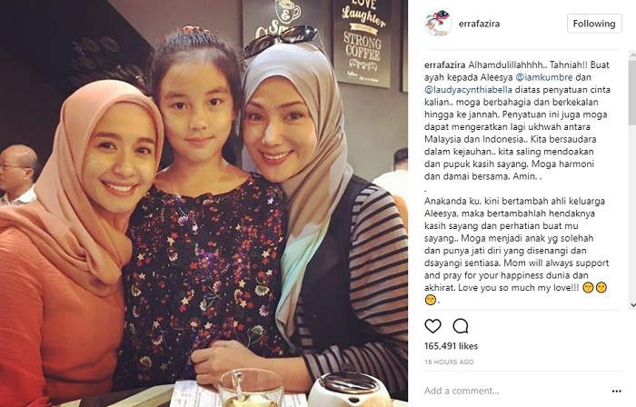 Dalam harapannya itu, Erra Fazira juga mendoakan sang putri untuk menjadi pribadi yang lebih baik. Apalagi kini kasih sayang untuk Aleesya akan bertambah setelah ayahnya menikahi Bella. "Anakanda ku, kini bertambah ahli keluarga Aleesya, maka bertambahlah hendaknya kasih sayang dan perhatian buat mu sayang.. Moga menjadi anak yg solehah dan punya jati diri yang disenangi dan dsayangi sentiasa. Mom will always support and pray for your happiness dunia dan akhirat. Love you so much my love!!!" tuturnya.