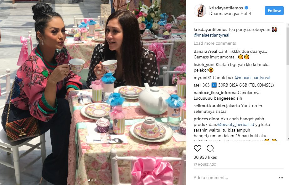 Melalui postingan di Instagram pribadinya, Krisdayanti pun membagikan potret cantik bersama Maia. Keduanya pun tampak menikmati pesta yang cukup meriah. Bahkan, tampak pula Krisdayanti dan Maia seolah tengah melakukan pesta teh dengan perabotan bernuansa pink dan putih. "Tea party suroboyoan @maiaestiantyreal," tulis Krisdayanti dalam keterangan postingannya.