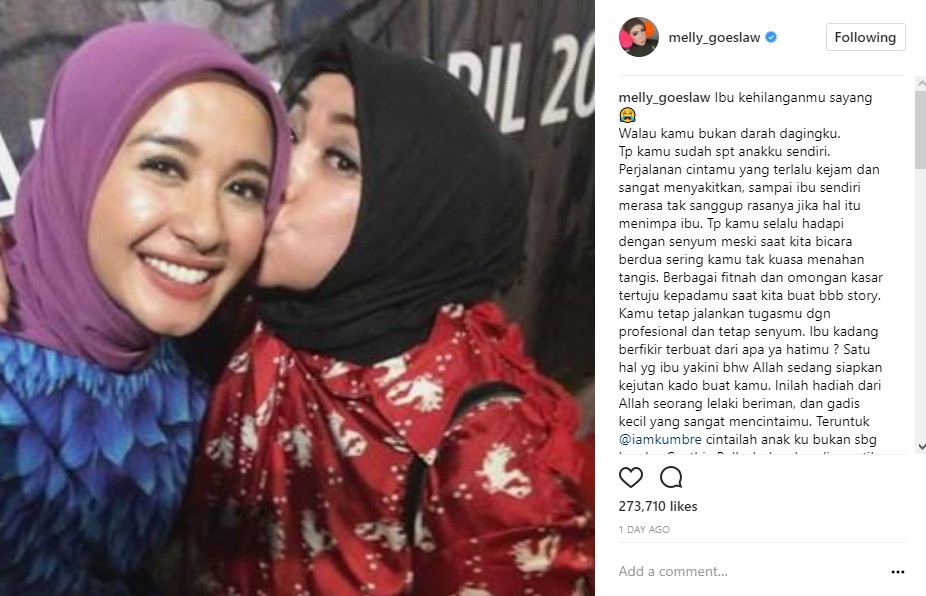 Meskipun bukan darah dagingnya, namun Melly menganggap Bella seperti anak kandungnya sendiri. "Ibu kehilanganmu sayang Walau kamu bukan darah dagingku. Tp kamu sudah spt anakku sendiri," tulis Melly dalam postingannya diselingi emoji menangis.