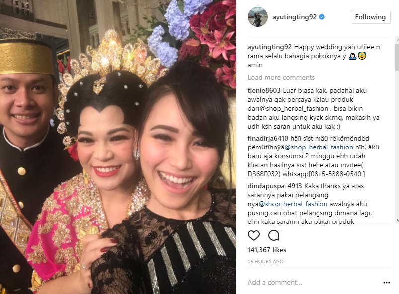 Sebaliknya, Ayu Ting Ting tampak hadir seorang diri. Dalam postingan yang diunggah di akun Instagram pribadinya pun tampak Ayu Ting Ting hanya melakukan pose selfie bertiga dengan kedua mempelai pengantin.